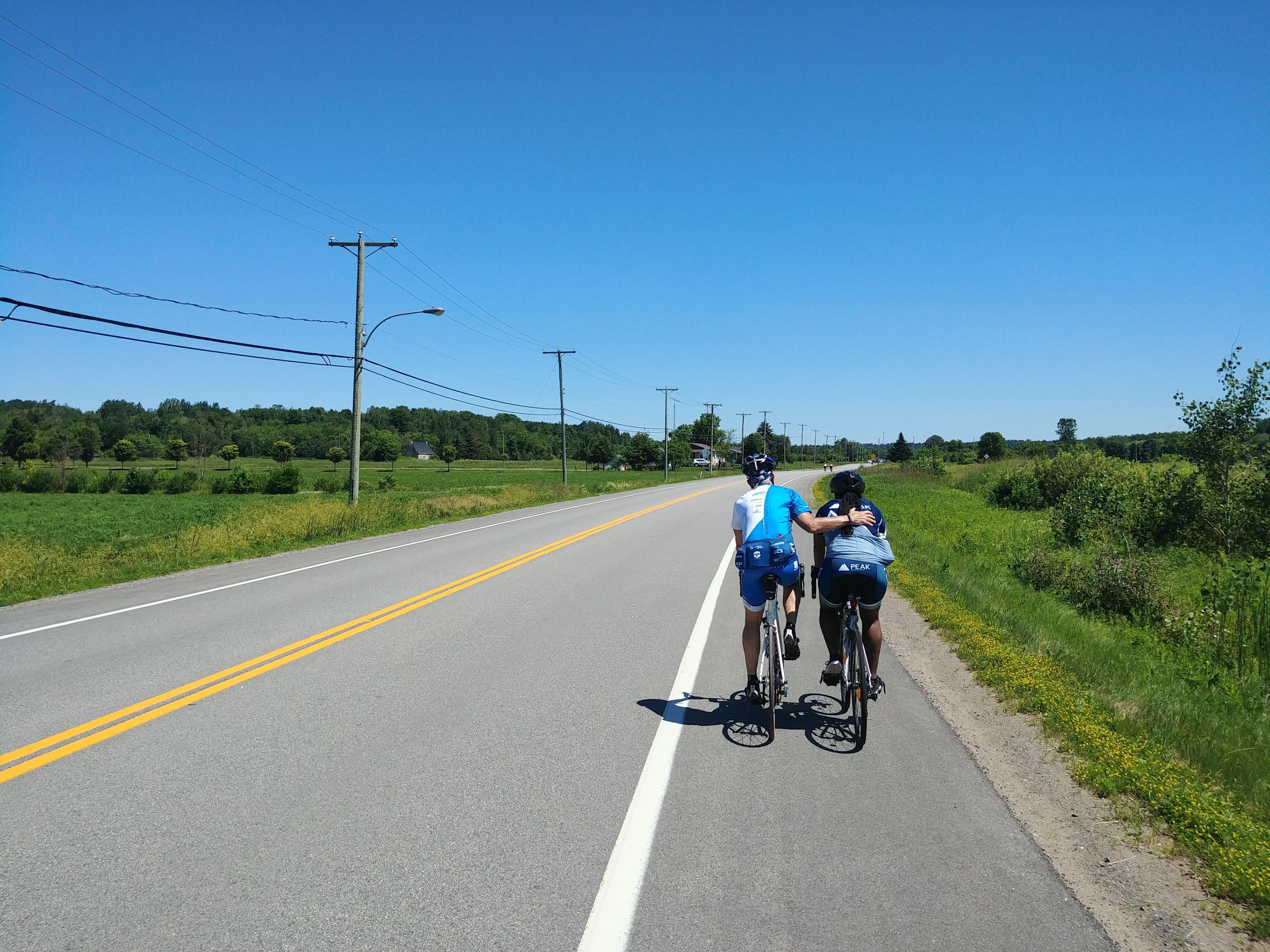 We managed to tuck behind a group of four very strong women riders, two of whom were wearing KPMG jerseys. Ah yes, I haven’t mentioned yet that there were a lot of corporate sponsors and big groups from Rogers, A&W (I guess their office is in Montreal?), some investment groups, some law firms, and an architecture firm. Generally they rode in big groups or they split into a few groups but I was impressed with their ability to stay together given the different pace I assume they would have had naturally. Partway through the second day, Jackie and I split off when I jumped onto a little peloton of people from a company called Genyk. They were all in their 50s or 60s and extremely strong… I was using them to block the wind and still pushing hard to keep a pace of around 29km/h, and we kept that up for about 15km until the next rest stop. Riding in a group like that really, really makes a difference for both wind resistance and for general inspiration, so I’m glad we had those experiences.