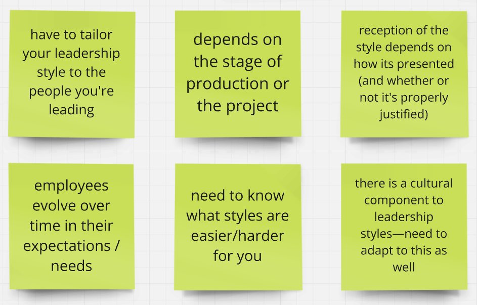 To read about all of the leadership styles discussed and their descriptions, see the appendix section below. Note that none of these leadership styles are “good” or “bad”, and we dismissed any styles which were outright negative. For example, “autocratic” is usually seen as dictatorial and therefore negative, but calling this style “commanding” (and with the definition given on the Miro board) this has a different connotation. As mentioned, these might be more management styles than leadership styles, a distinction I didn’t make before the session.